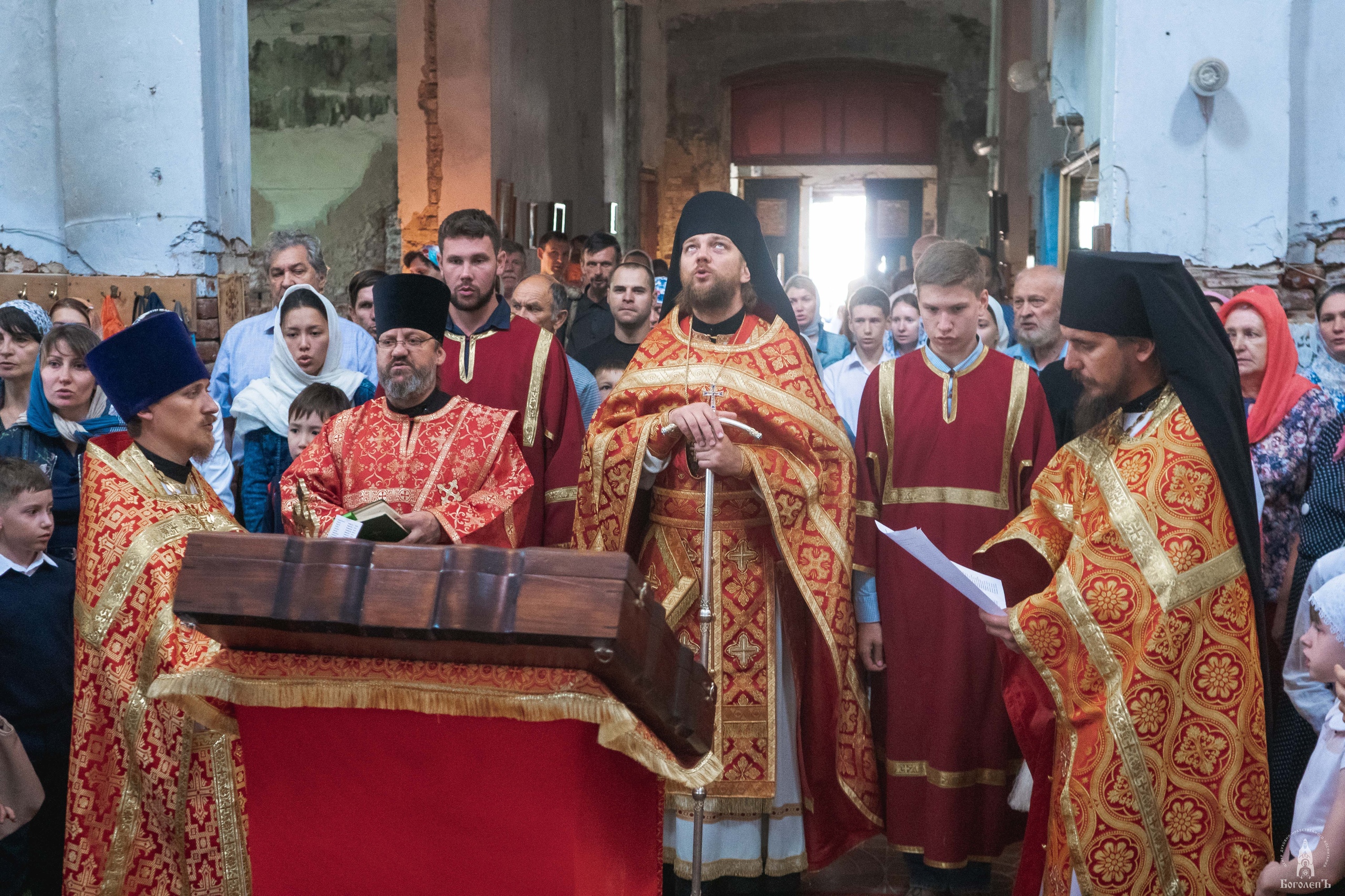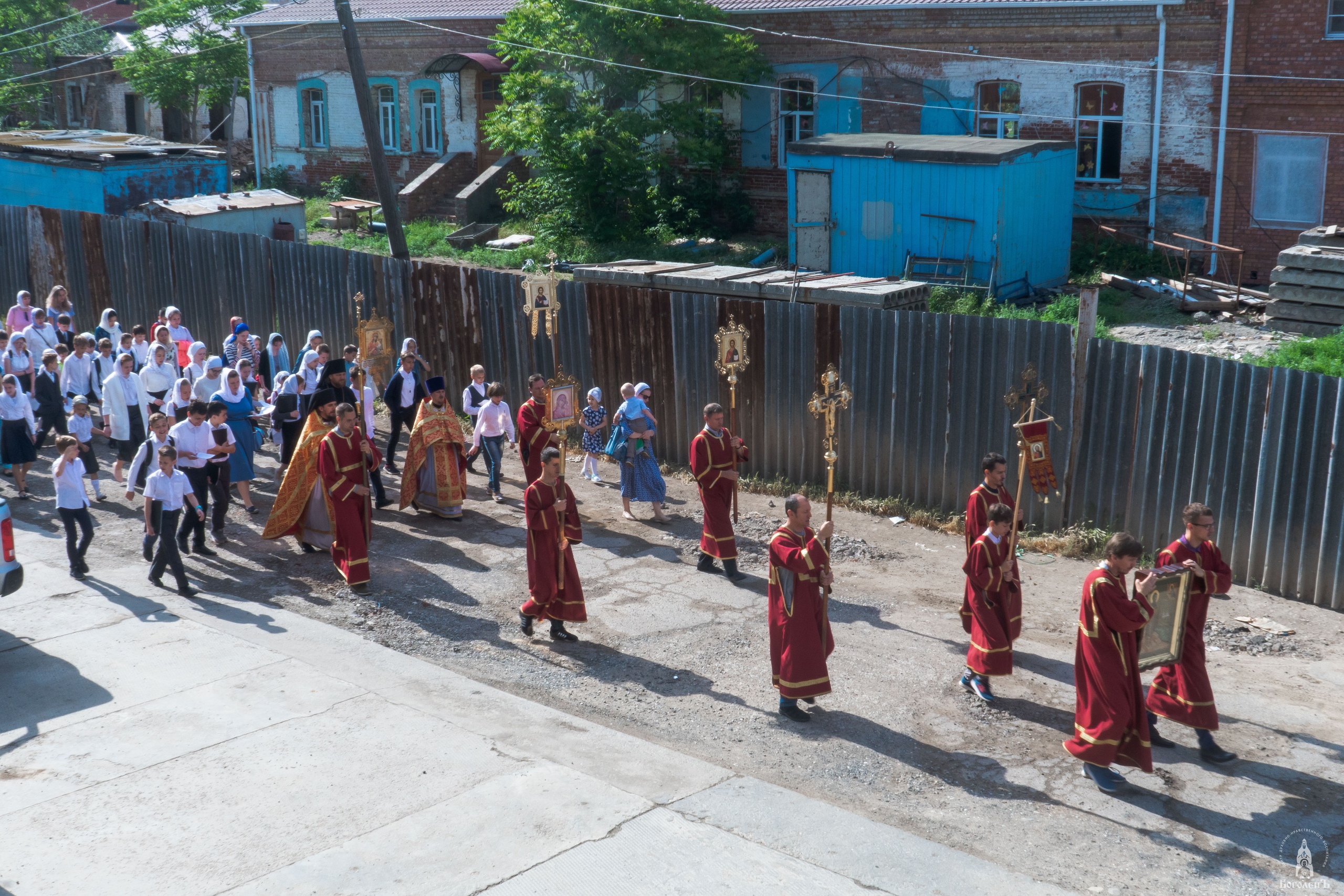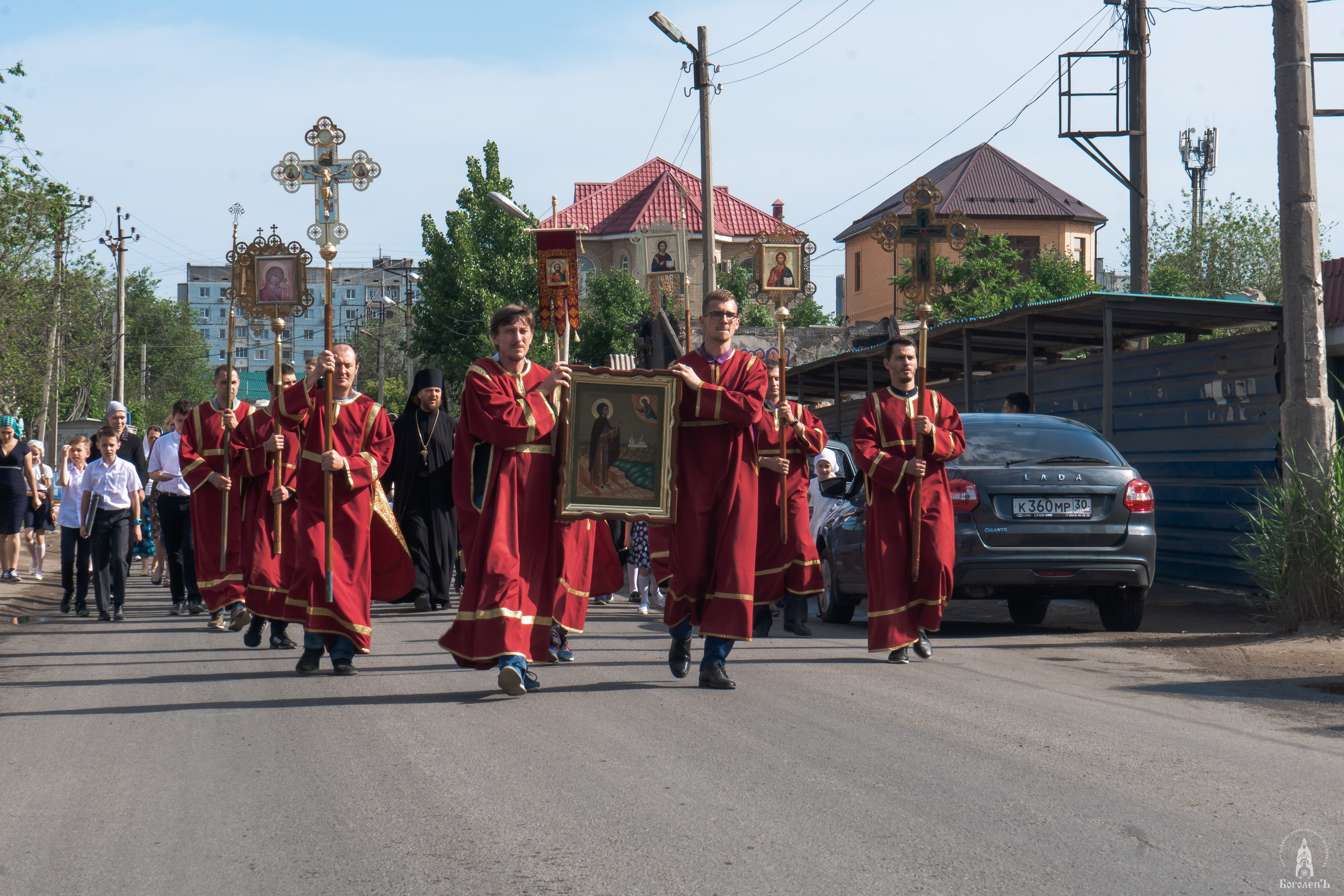 Крестный ход от Введенского храма до Иоанно-Предтеченского монастыря сопровождался Пасхальными песнопениями. Впереди колонны хоругвеносцы несли Образ святого преподобного Боголепа Черноярского и Астраханского.